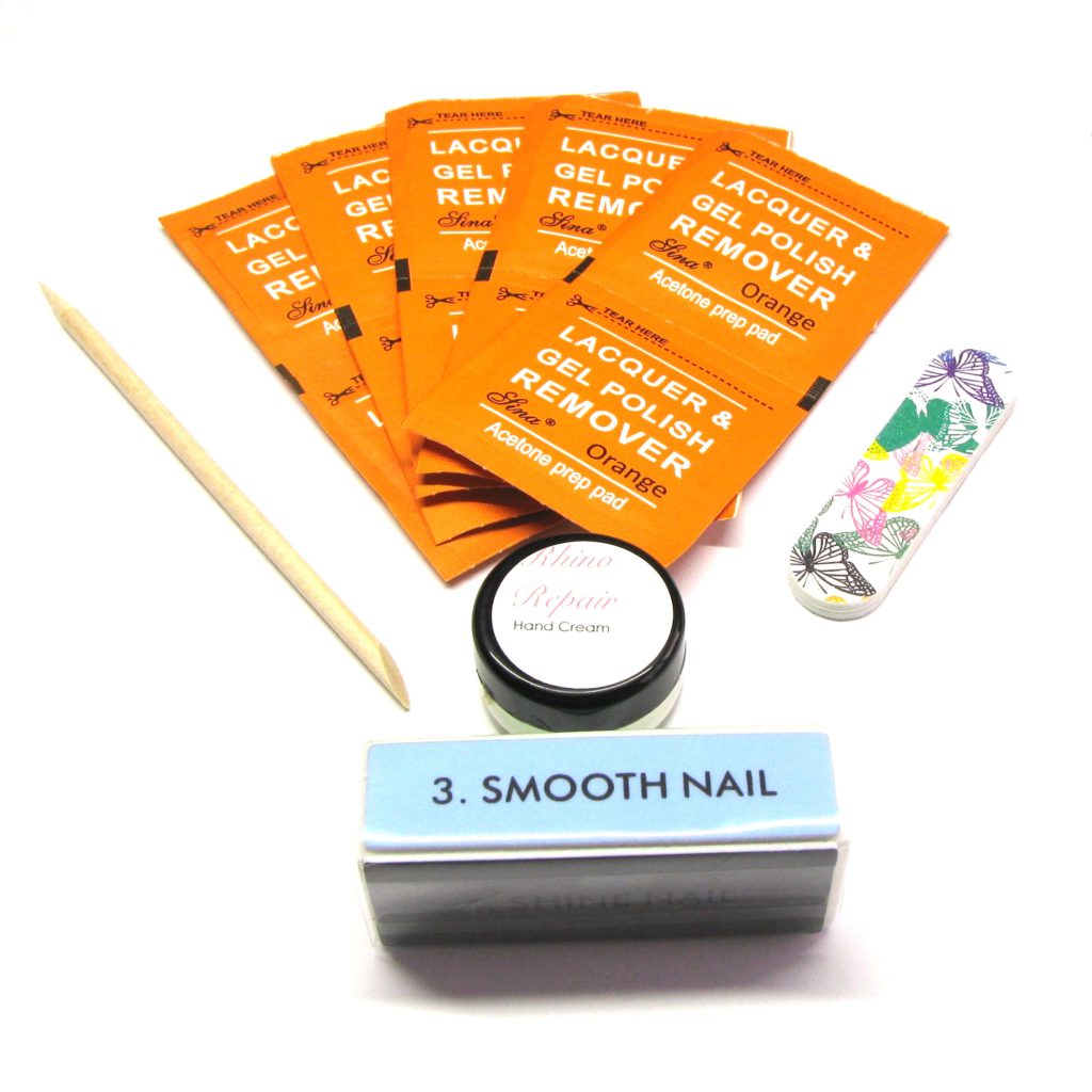 I do sell gel polish removal packs that contain a nail file and buffing block, cuticle stick, ten removal wraps containing acetone, and a small pot of hand lotion. If you’d like one of these packs, kindly ask at your next manicure appointment or purchase one from our online store. If you’ve already purchased a removal pack and still have the nail file, buffing block and wooden cuticle stick, I can sell you the removal wraps without you needing to purchase an entire removal kit.