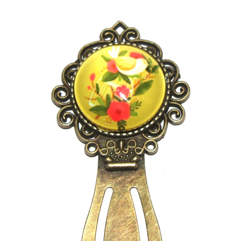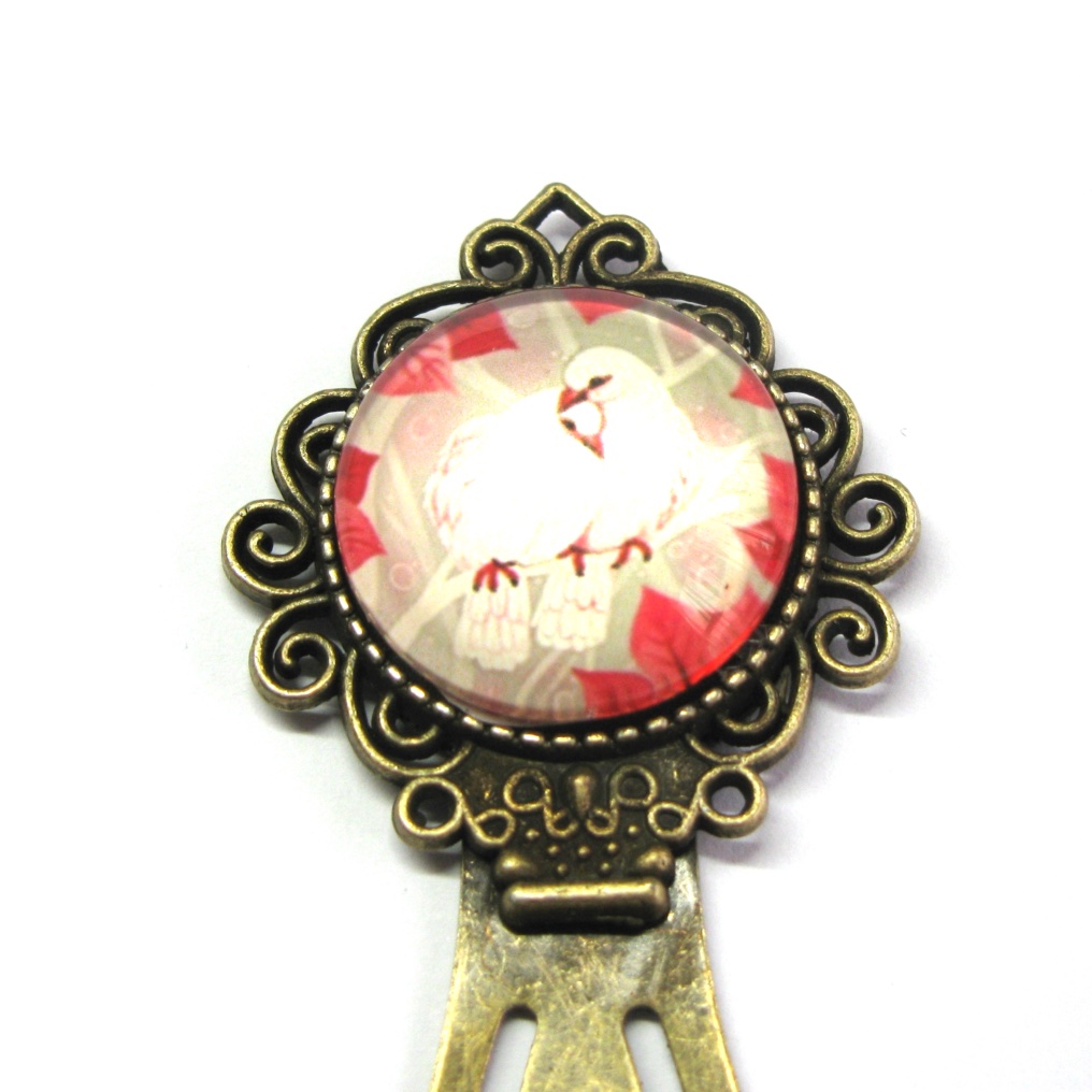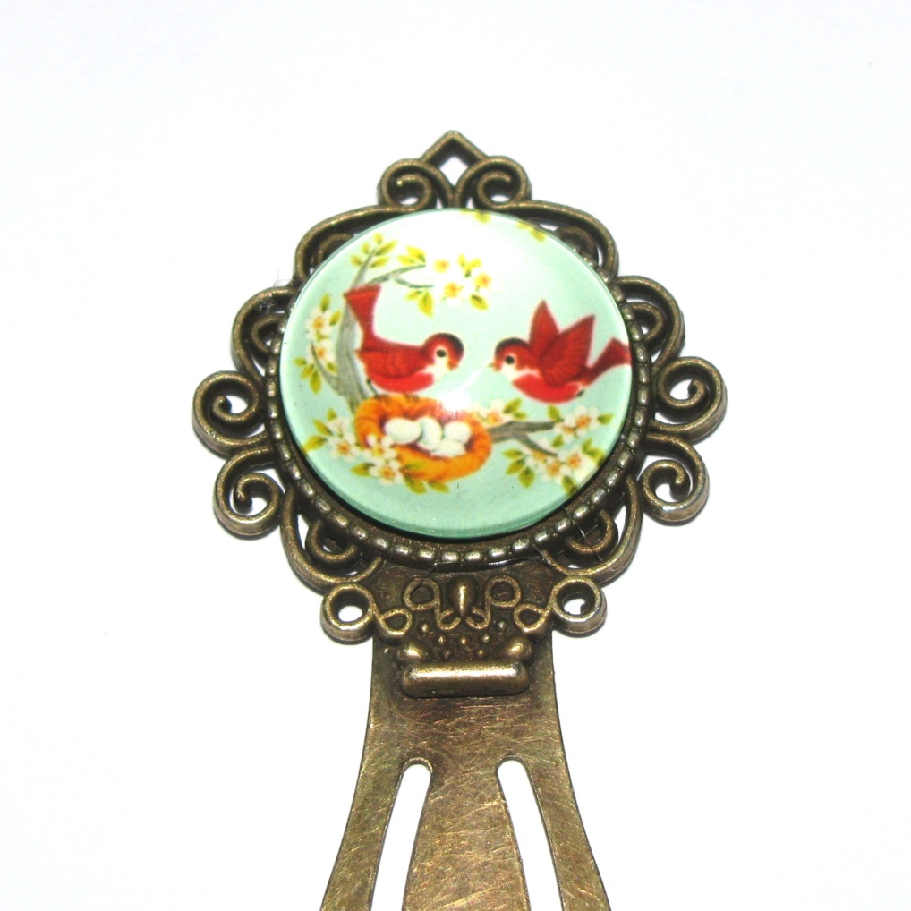 Antique bronze bookmarks with assorted bird designs in glass cabochons.