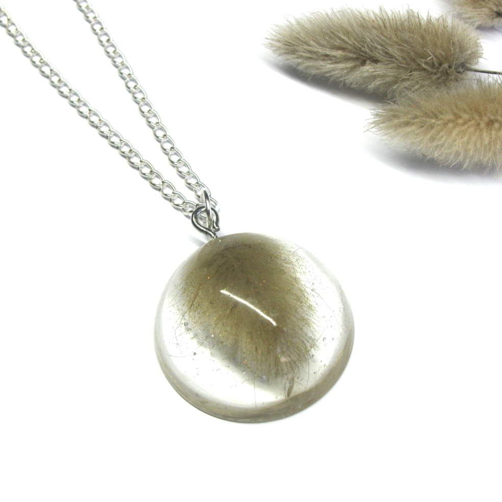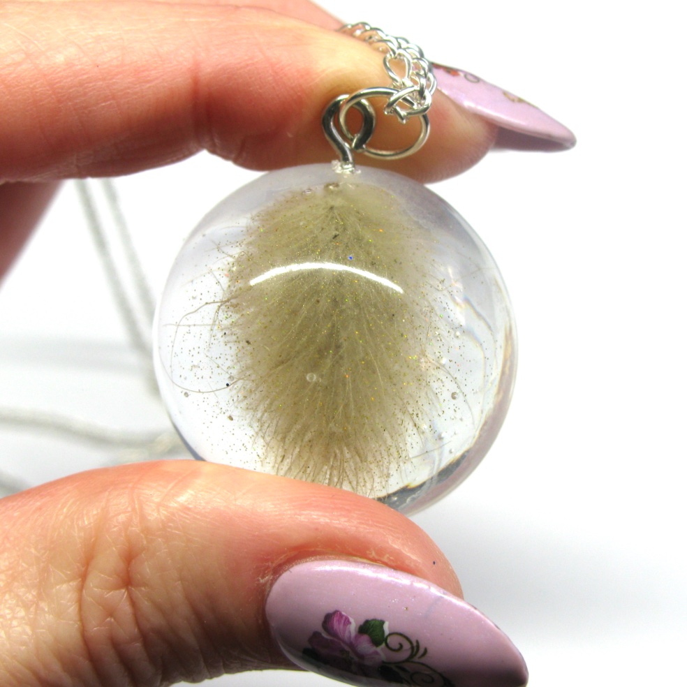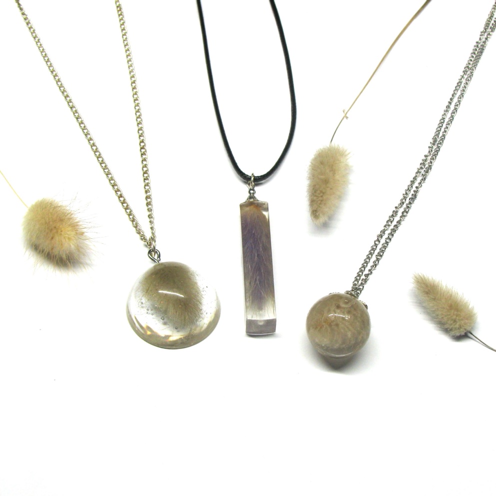 Real, dried Bunnytail grass has been set in clear resin, and dangling off black cord or chain.
