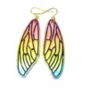 Lightweight resin earrings with hand painted butterfly wing designs, dangling on gold plated ear wires.