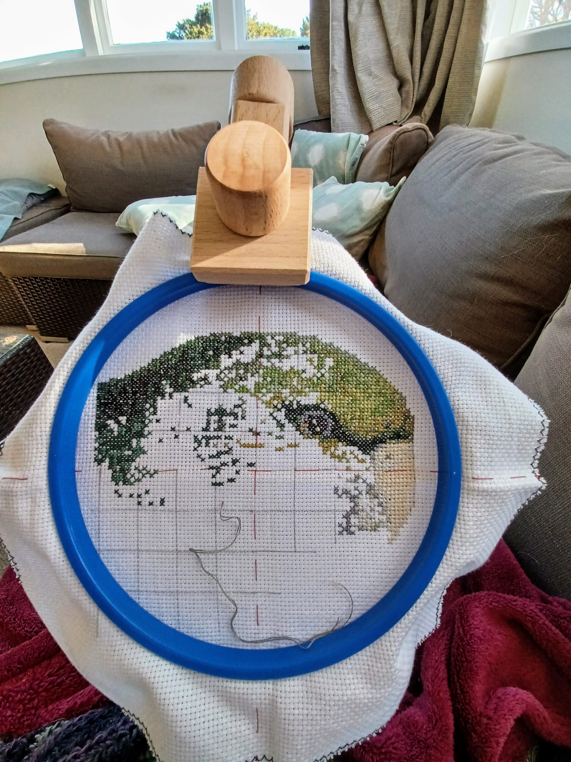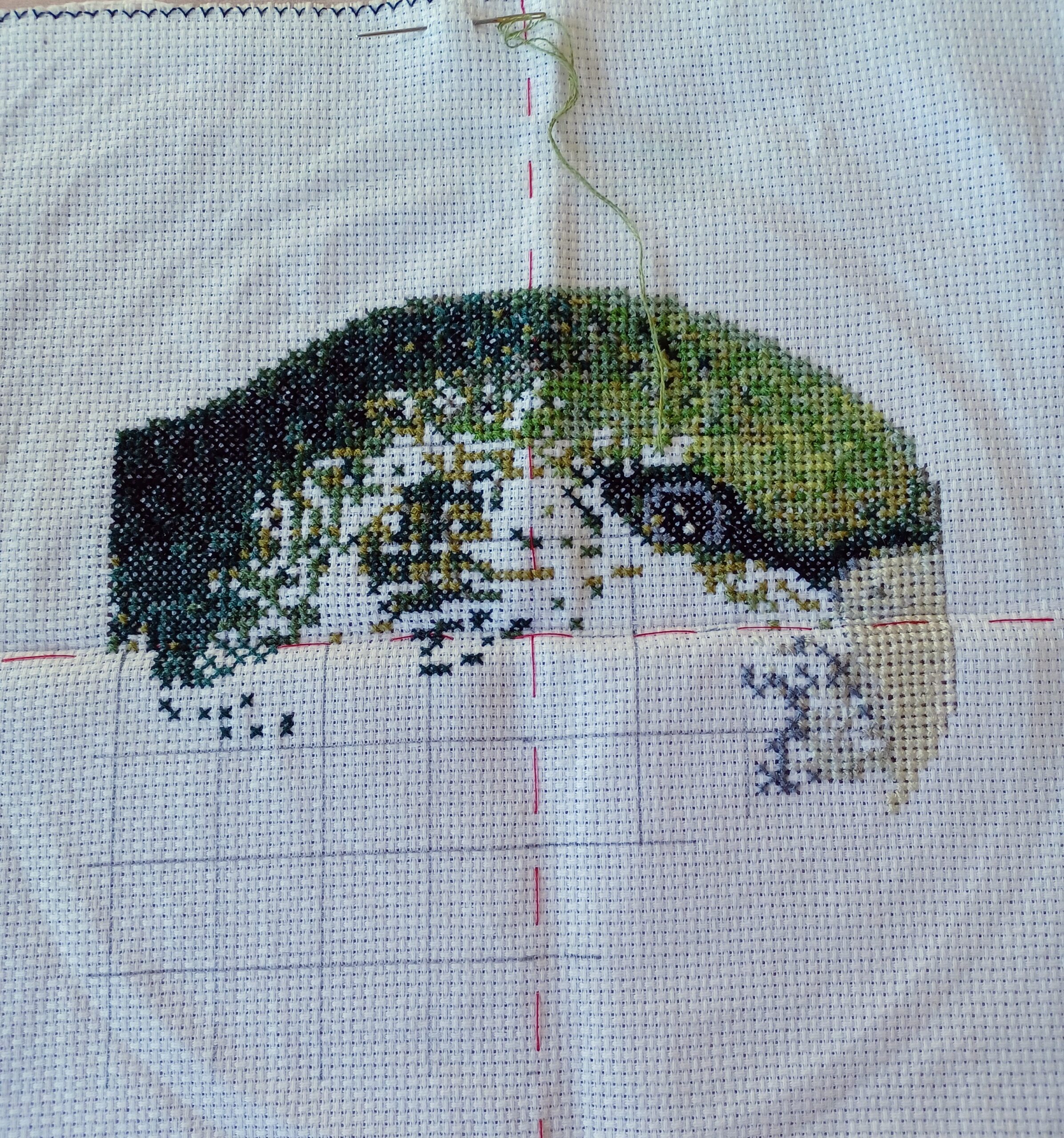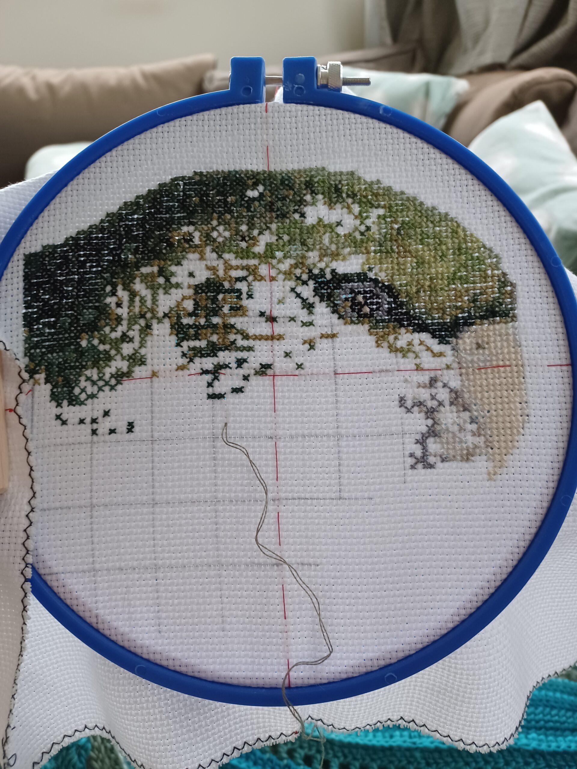 Classic Kākāpō cross-stitched on white fabric and framed in a black frame.