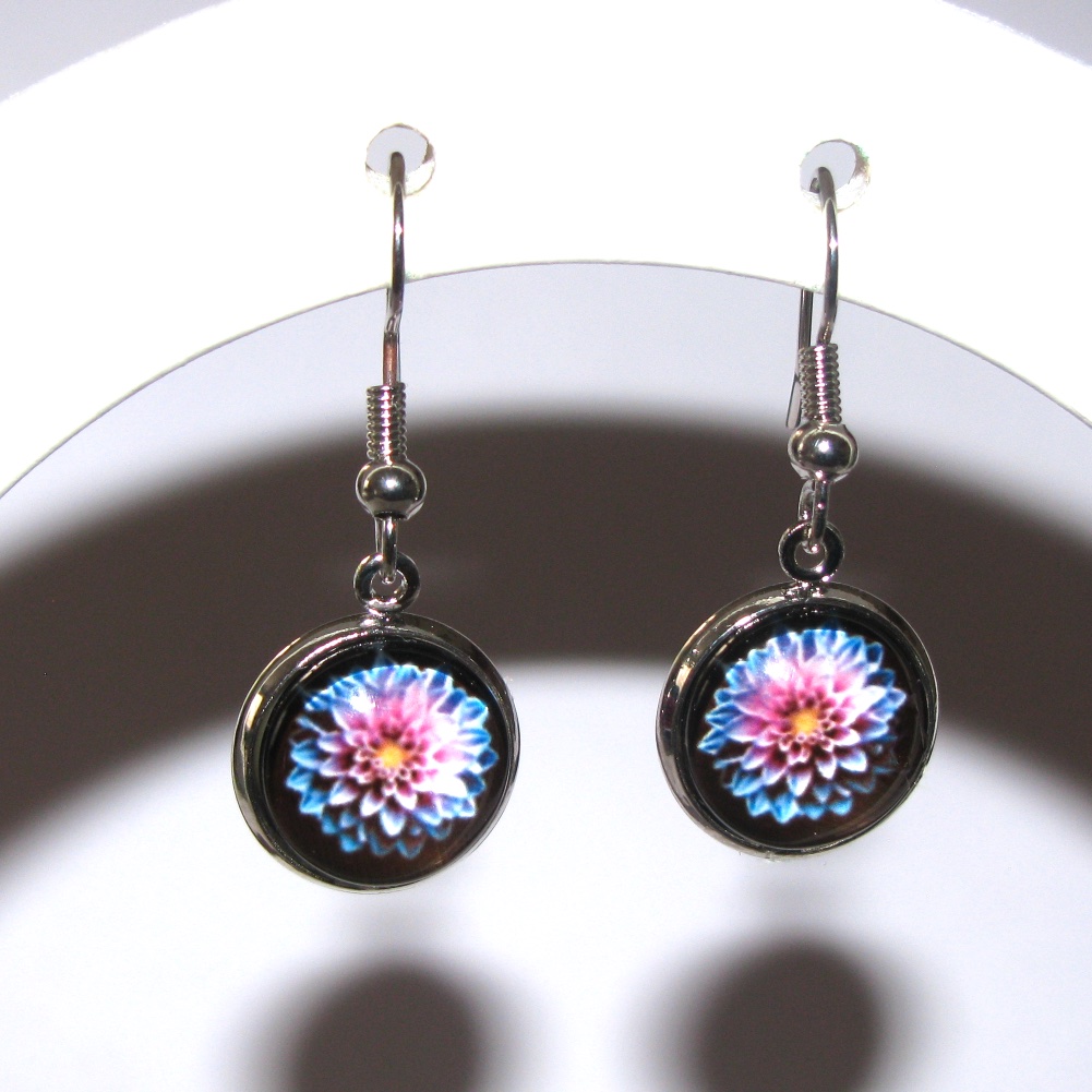 Pink and purple dahlia flower patterns set in bezels with glass cabochons and French ear wires.