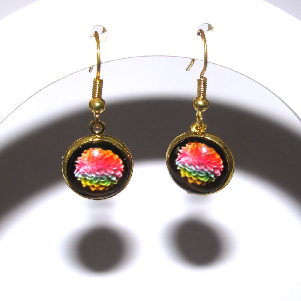 Colourful dahlia flower patterns set in bezels with glass cabochons and French ear wires.
