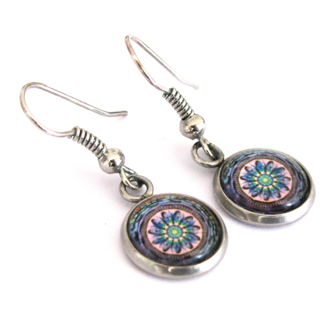 Pink and blue mandala cabochons set in silver bezels and dangling off of silver French hook ear wires.