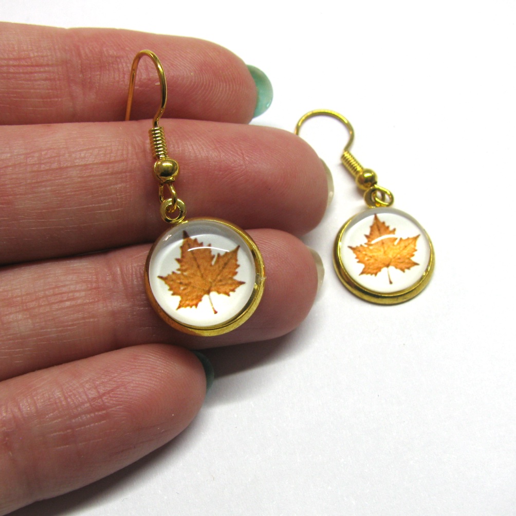 Golden brown maple leaf patterns set in bezels with glass cabochons.