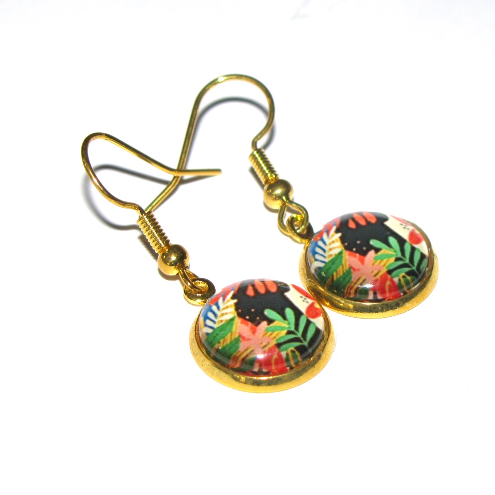 Bright green and red Monstera leaf patterns set in bezels with glass cabochons.