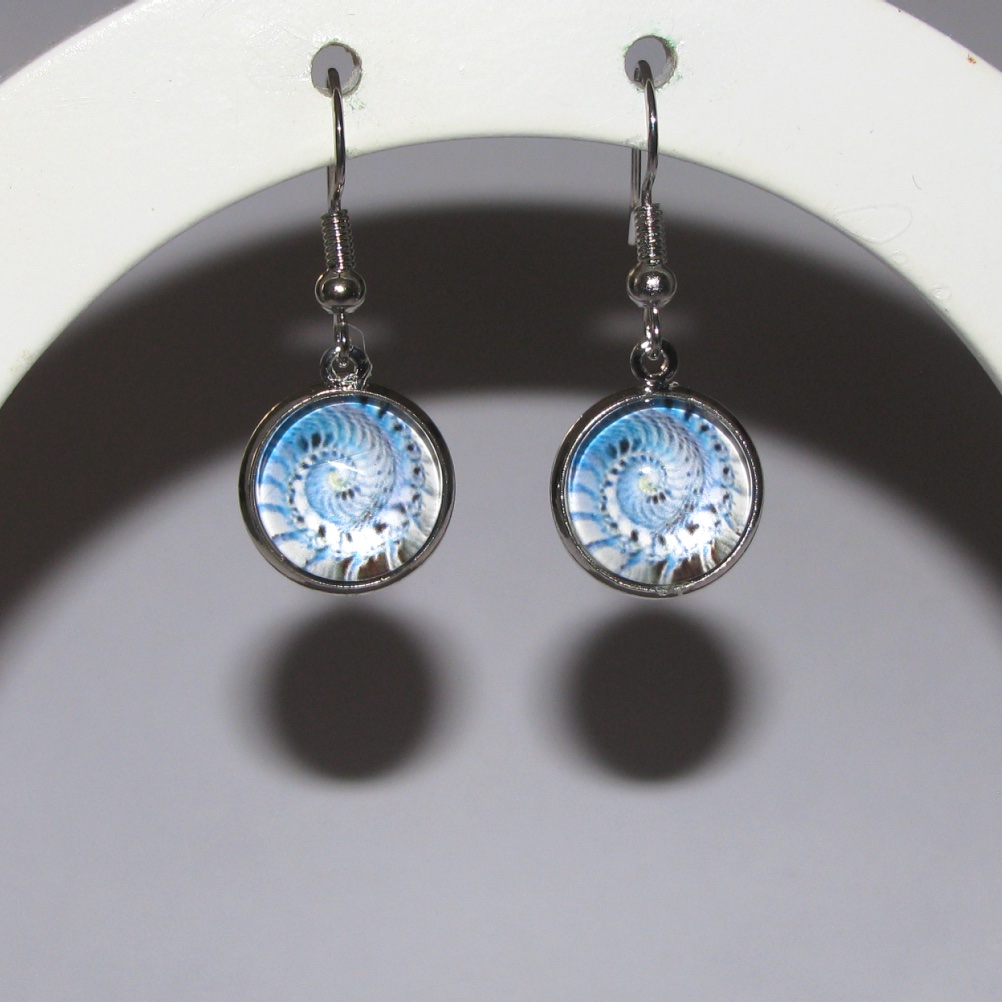 Blue nautilus patterns set in bezels, with glass cabochons, that dangle off of French hook ear wires.