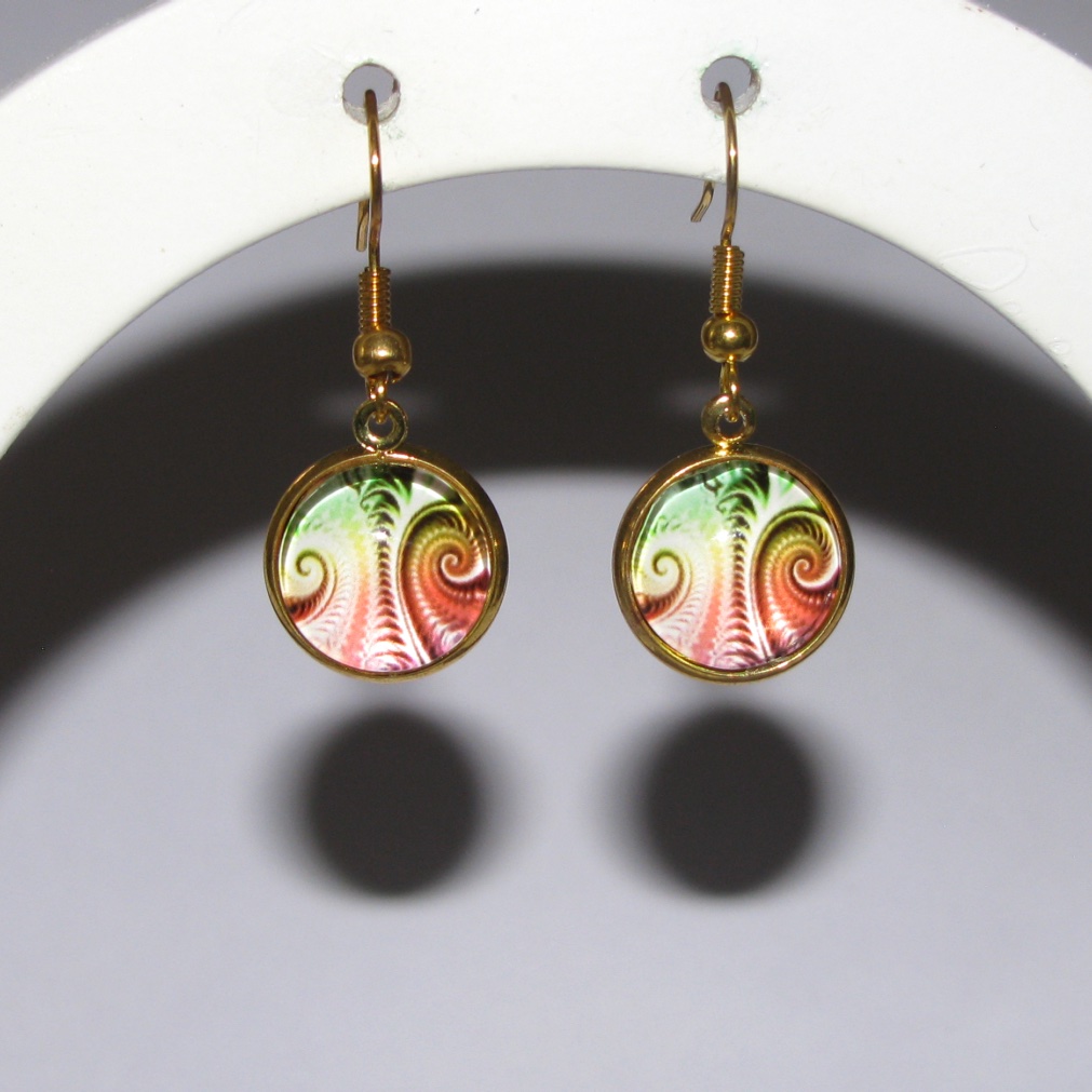 Green and red nautilus patterns set in bezels, with glass cabochons, that dangle off of French hook ear wires.