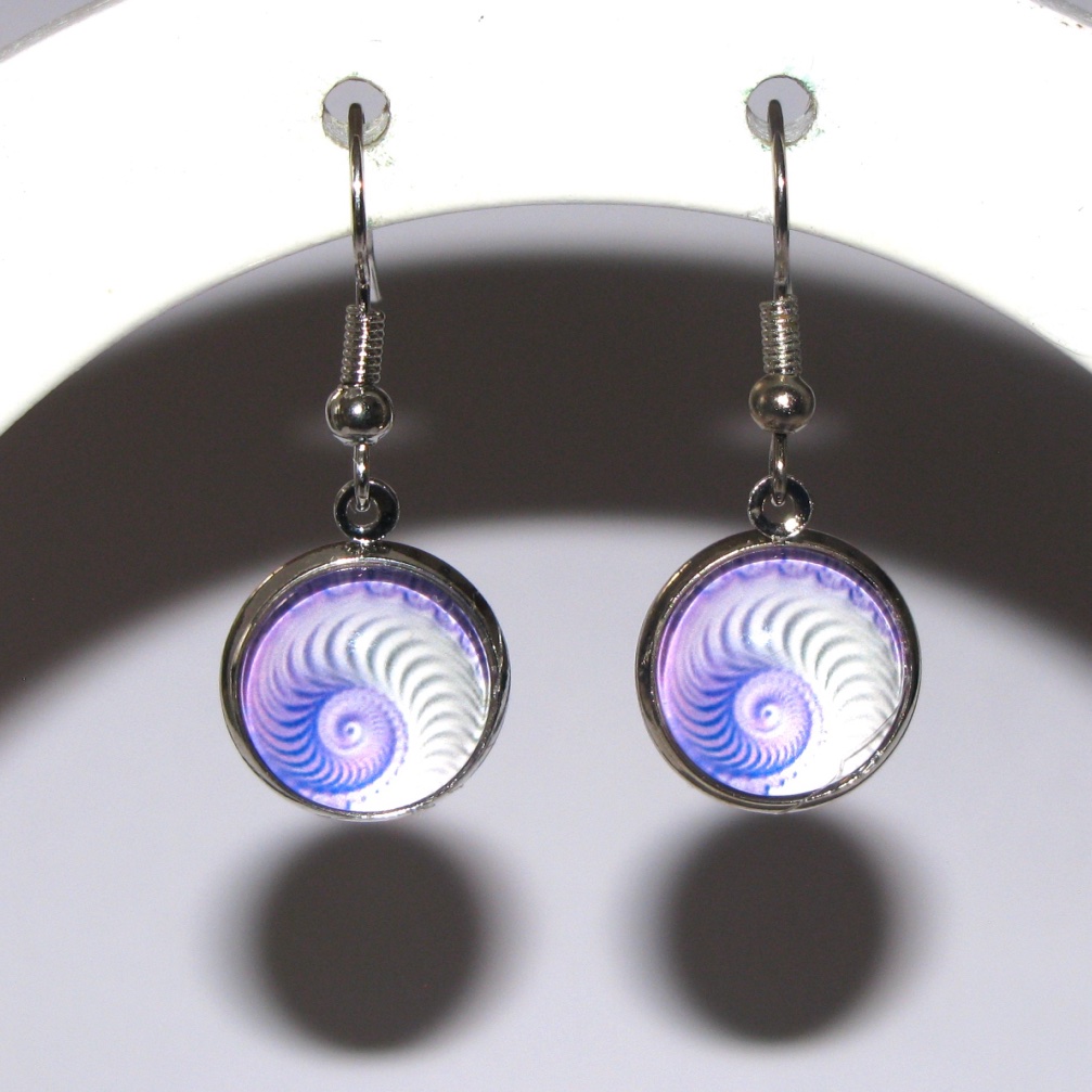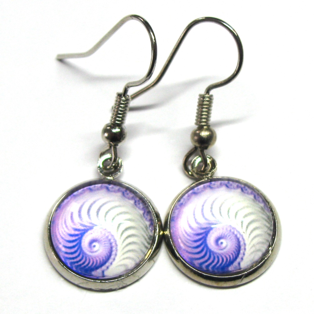 Purple nautilus patterns set in bezels with glass cabochons, that dangle off of French hook ear wires.