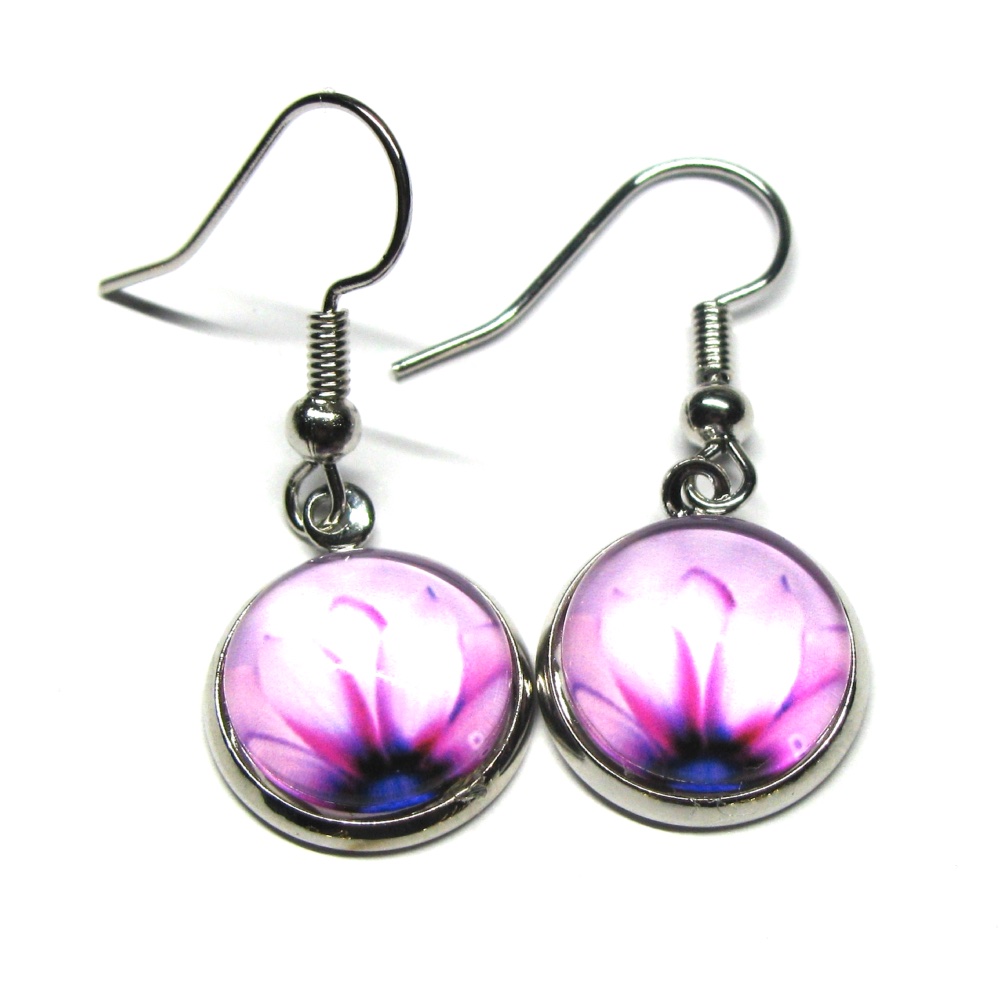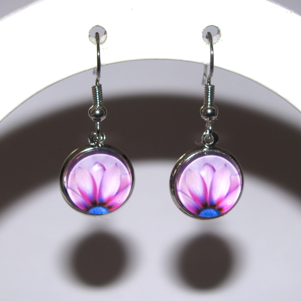 Pink daisy patterns set in bezels with glass cabochons on French ear wires.