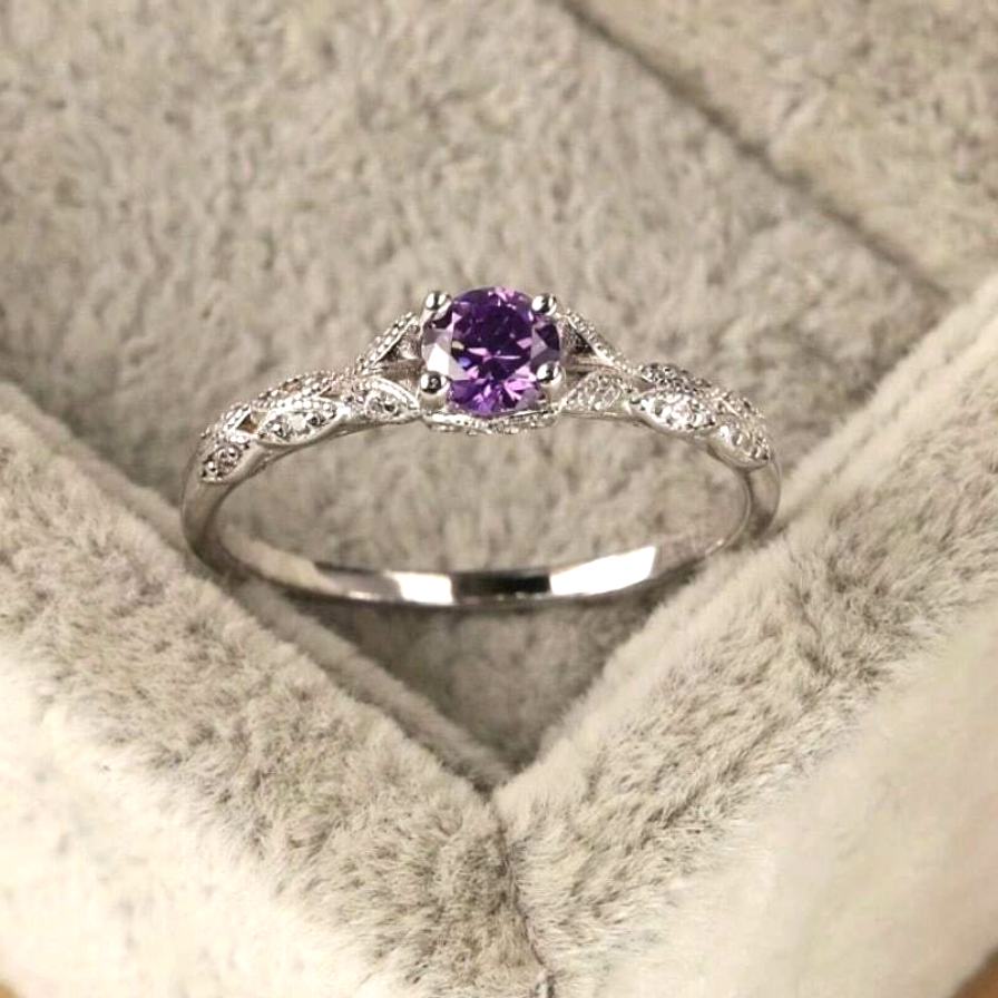 Assorted silver vintage bands with purple amethyst cubic zirconia.