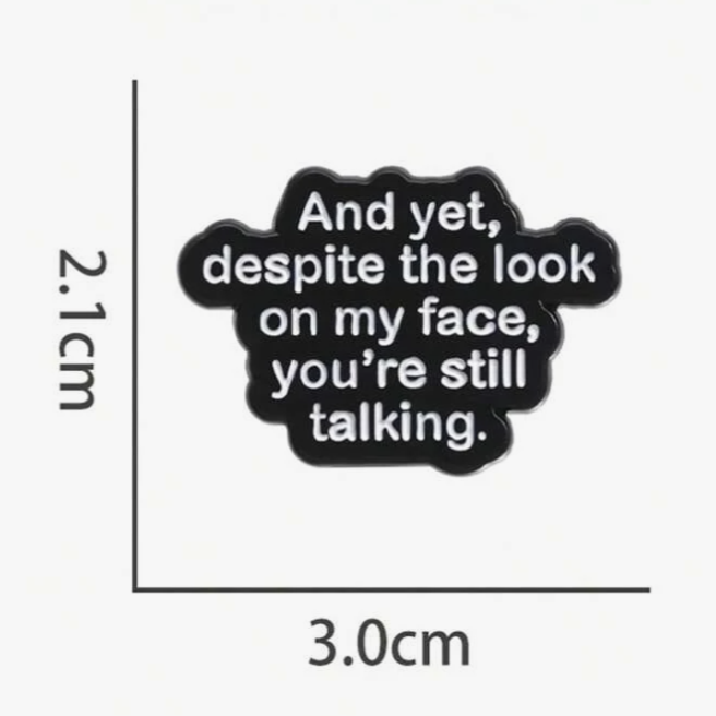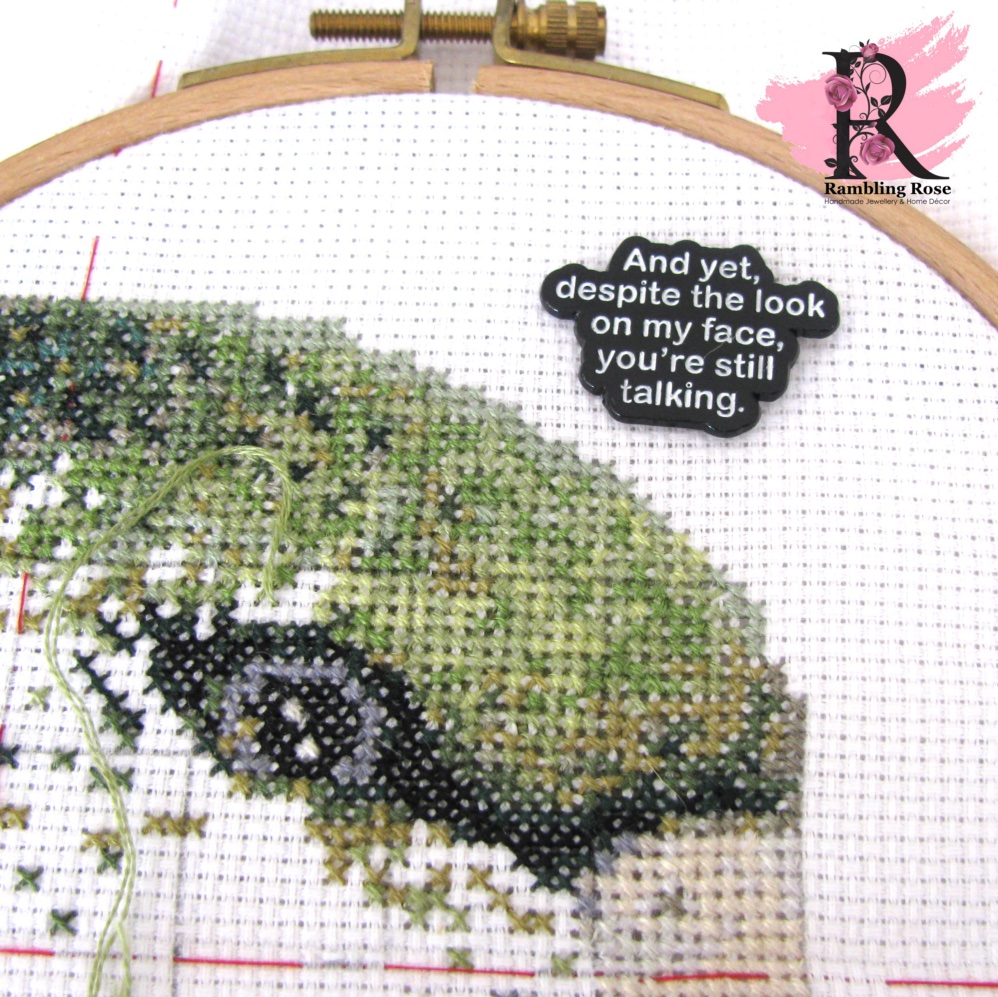 “And yet, despite the look on my face, you’re still talking.” Enamel magnetic needle minder to keep your needle safe while you’re changing floss colours or storing your item between stitching sessions.