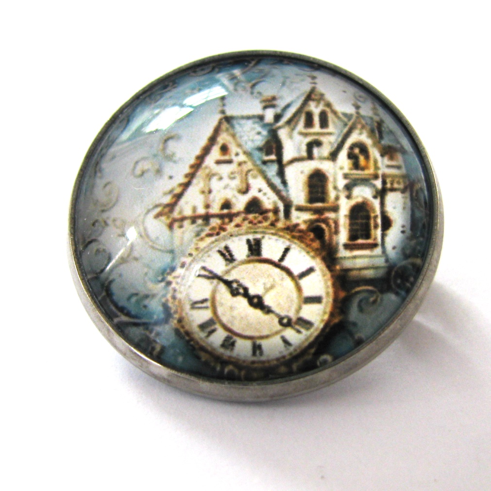 Brown and blue town clock design under an acrylic cabochon, set in a stainless steel round bezel with a brooch pin back.