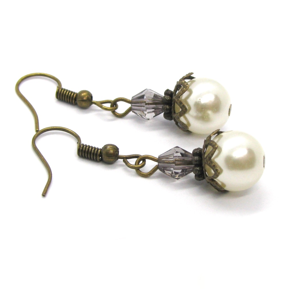 These ‘Vintage Bridal’ bronze and white pearl earrings are made with 10mm white glass pearls, bronze bead caps, bronze spacer beads, and 6mm ‘black diamond’ crystals.
