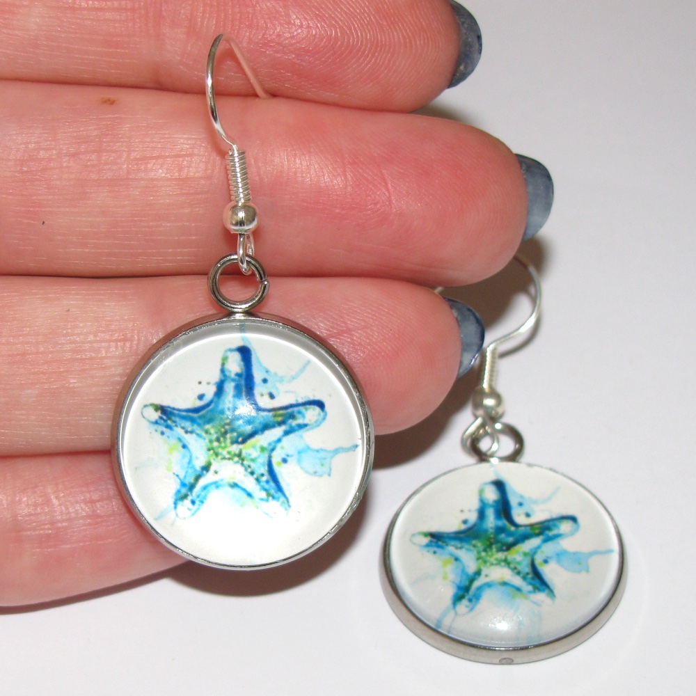 Serene blue and green Starfish are set in silver bezels and dangle off of silver French hooks.