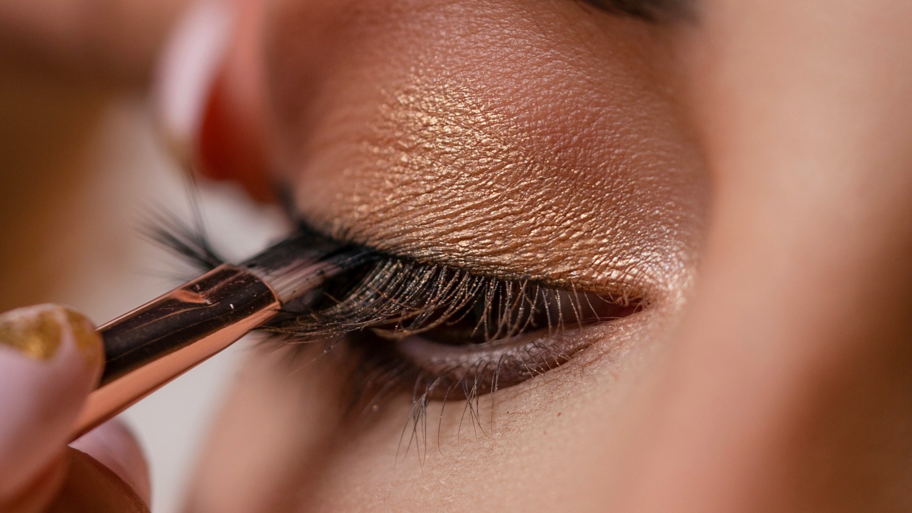 I gently line the area between my lashes with a long-wear eyeliner pencil. A brush loaded with pigment, dark eyeshadow or gel eyeliner can also be used. If you’re using pencil eyeliner, use small backward and forward strokes until there is a nice, solid line. If you prefer to use pigment or gel eyeliner, use an angled brush and coat both sides of the brush tip, making sure to wipe off any excess, you don’t want it falling into your eye. Hold the brush vertically and then wiggle the tip gently onto the top waterline, moving across your eyelid, wiggling as you go to get the product into any gaps between the lashes.